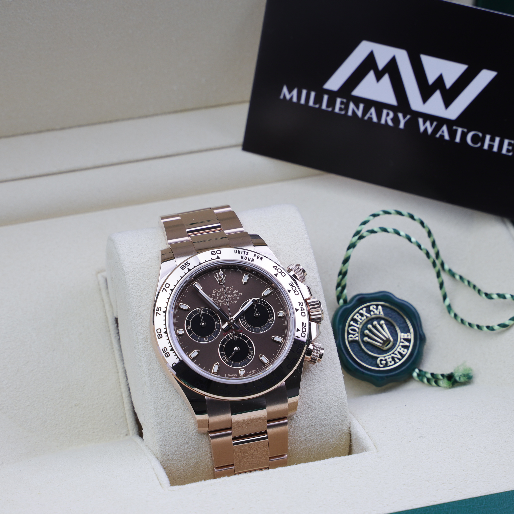 Rolex 116515ln chocolate cosmograph daytona everose gold post a public question about this product. Cosmograph daytona oyster, 40 mm, everose gold. This oyster perpetual cosmograph daytona in 18 ct everose gold with a chocolate and black dial and an oysterflex bracelet, features a black cerachrom bezel with tachymetric scale.. Breathtaking in beauty and design, this popular model is a one of the most coveted models within the pricey daytona category.